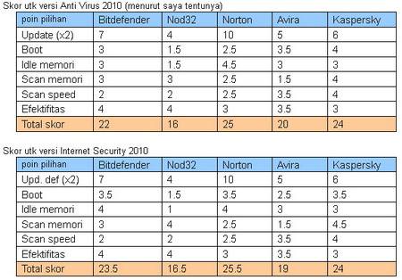- Mulai 2011 berdasar review2 di forum online, ingin coba antivirus lain. Saat itu juga saya baca review komparasi/benchmark AV dari situs luar negeri. Dari 2-3 situs yg saya baca, saya membuat table skor dan perbandingan antar AV dengan point2 yang saya anggap vital sesuai kebutuhan saya.